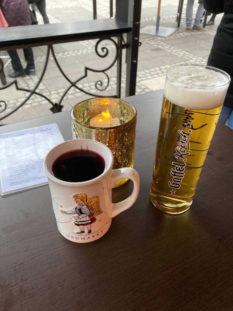 - Glühwein is the traditional Christmas market drink, which is a mulled wine normally made of red wine. Each market has its own unique mug that you can buy for around 2-3 Euros. It’s a great, inexpensive souvenir. You can always choose not to buy the mug. *There are always nonalcoholic options, too.
